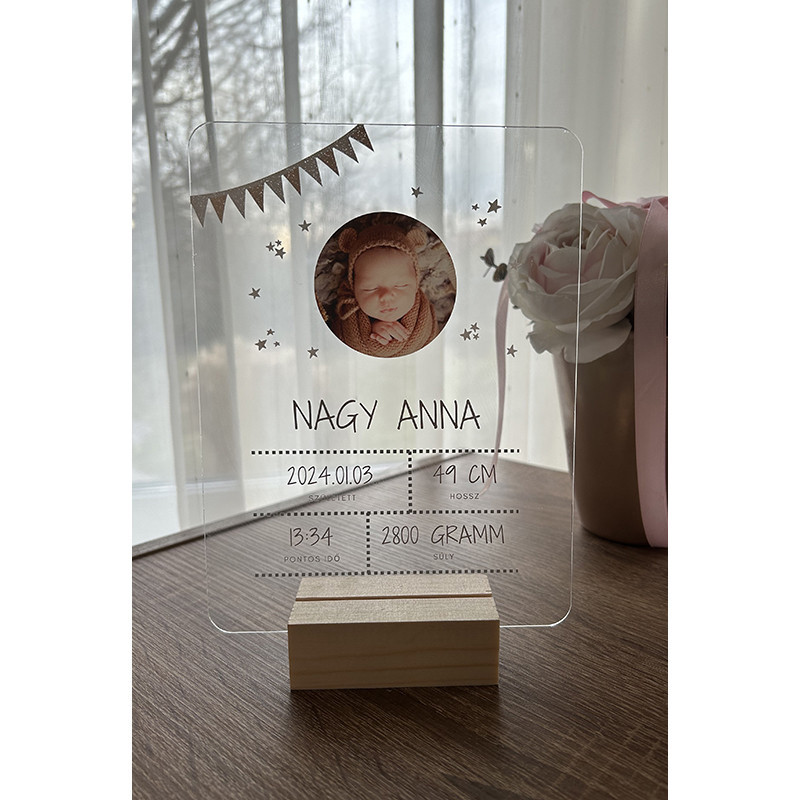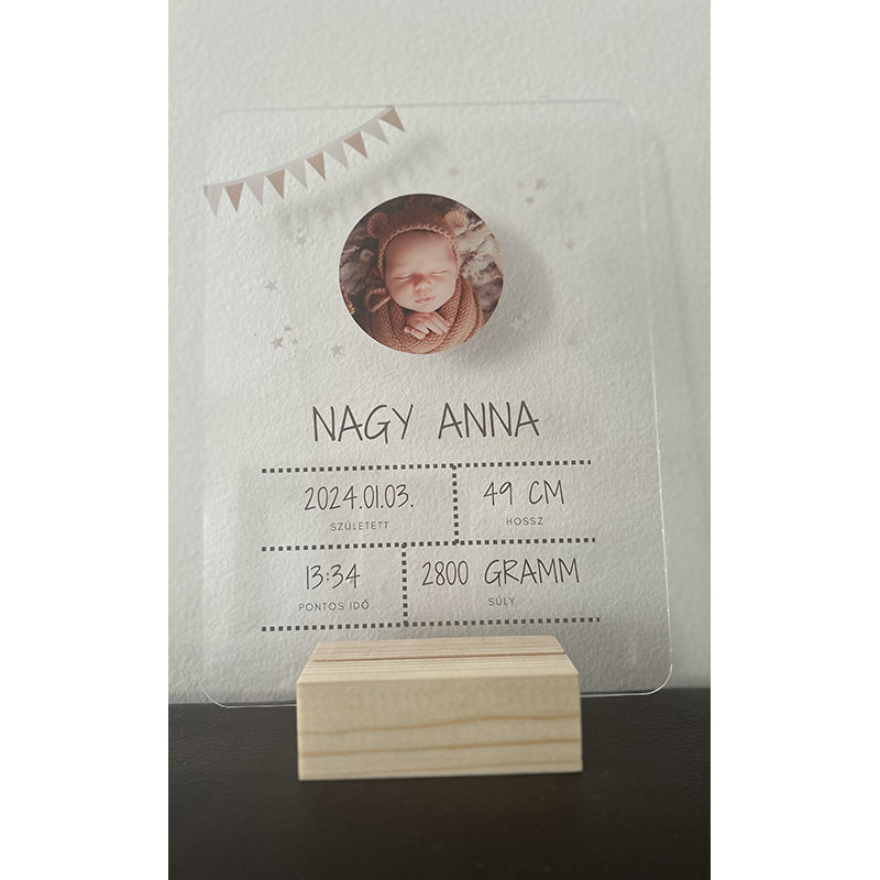 A saját fotóval és adatokkal ellátott átlátszó akril babaszületése emlékőrző mérete 150 mm X 200 mm, vastagsága 2 mm, melyhez biztosítunk egy natúr fatalpat is.